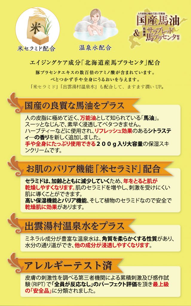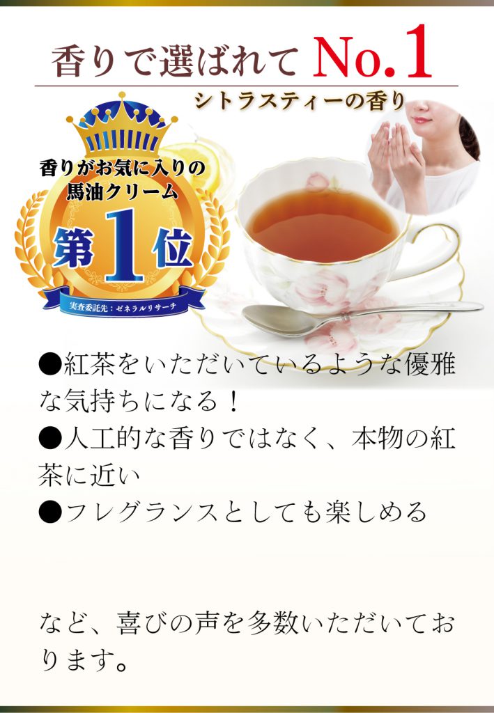 - 人の皮脂に極めて近く、万能油として知られている「馬油」スーッとなじんで、素早く浸透してベタつきません。ハーブティーなどに使用され、リフレッシュ効果のあるシトラスティ―の香りを新しく追加しました。手や全身にたっぷり使用できる200g入り大容量の保湿スキンクリームです。