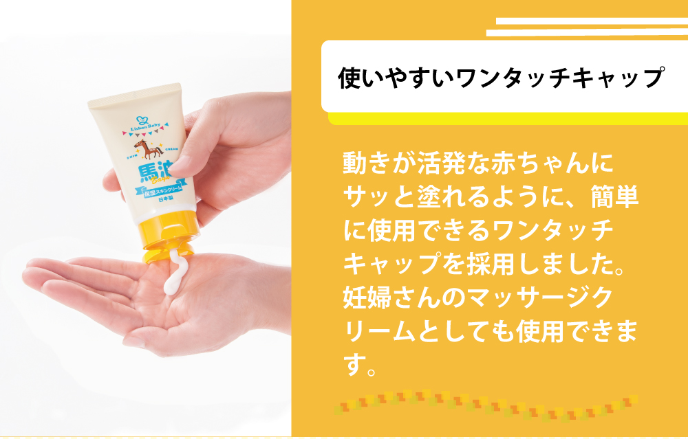 - 動きが活発な赤ちゃんにサッと塗れるように、簡単に使用できるワンタッチキャップを採用しました。妊婦さんのマッサージクリームとしても使用できます。