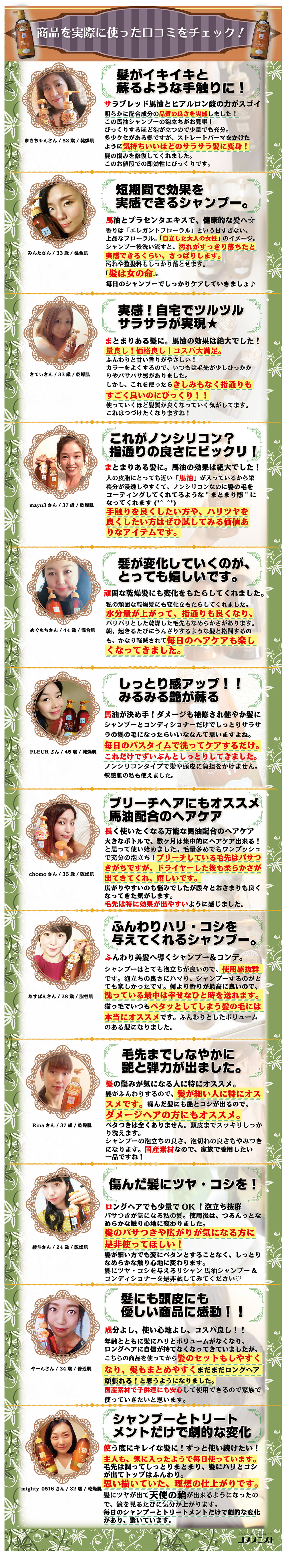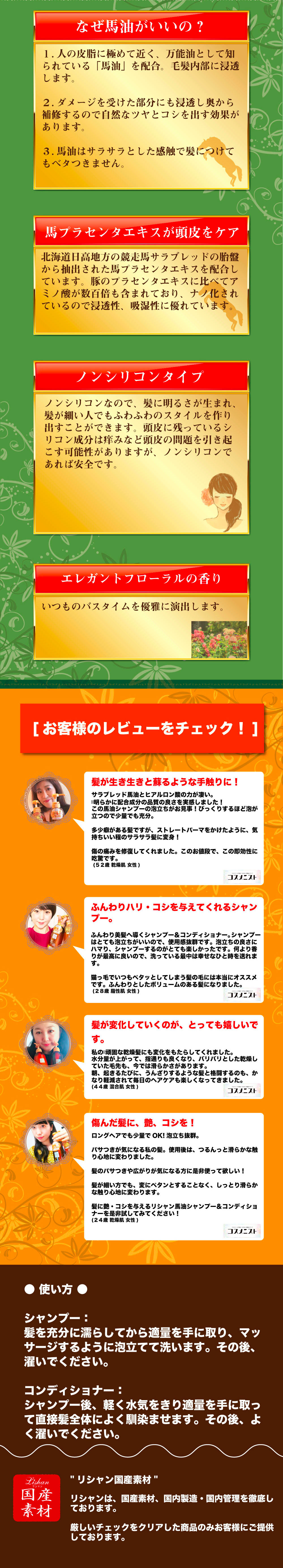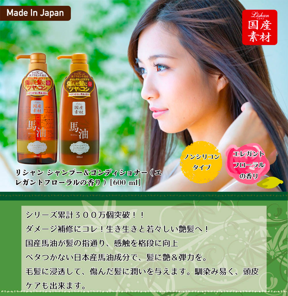 - 人の皮脂に極めて近く、万能油として知られている「馬油」を配合。国産の良質な馬油を配合。毛髪内部に浸透します。