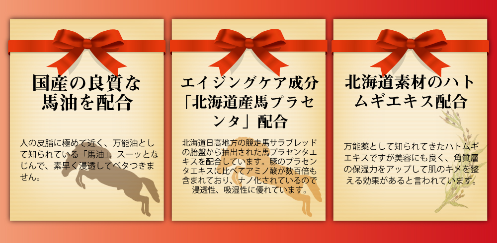 - 北海道日高地方の競走馬サラブレッドの胎盤から抽出された馬プラセンタエキスを配合しています。豚のプラセンタエキスに比べてアミノ酸が数百倍も含まれており、ナノ化されているので浸透性、吸湿性に優れています。