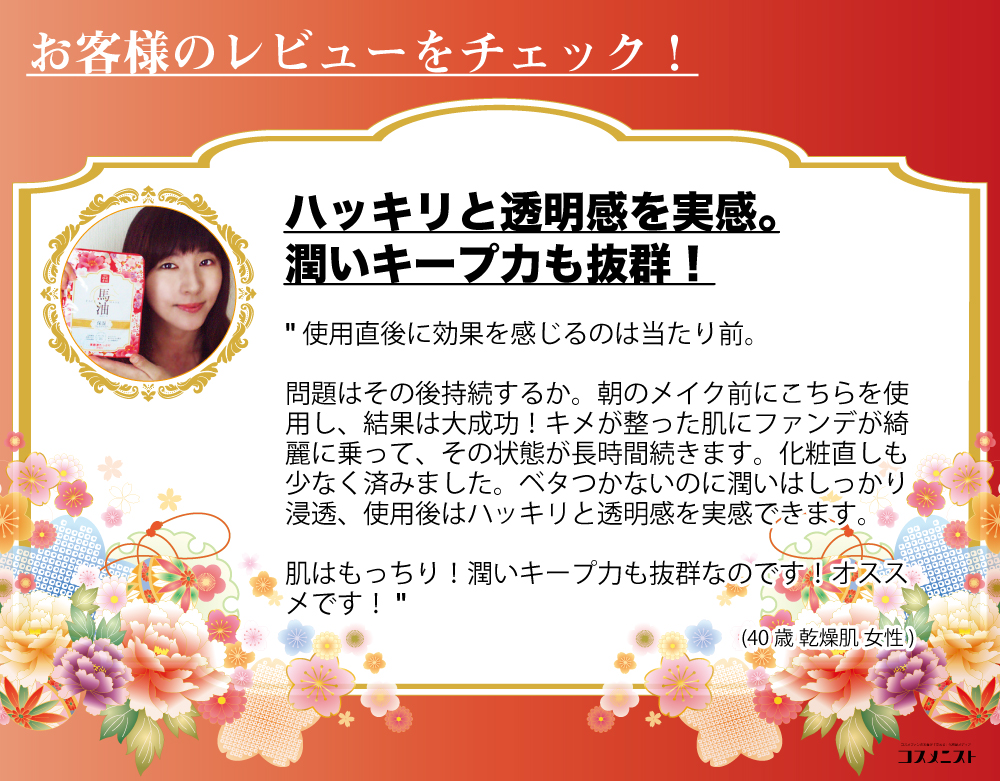 - 人の皮脂に極めて近く、万能油として知られている「馬油」。スーッとなじんで、素早く浸透してベタつきません。