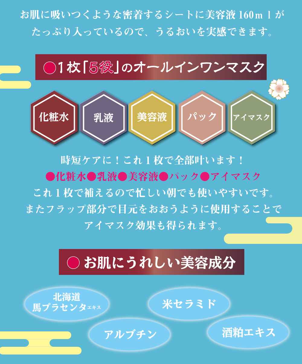 - 化粧水、乳液、美容液、パックがこれ1枚で補えるので忙しい朝でも使いやすいです。またフラップ部分で目元をおおうように使用することでアイマスク効果も得られます。