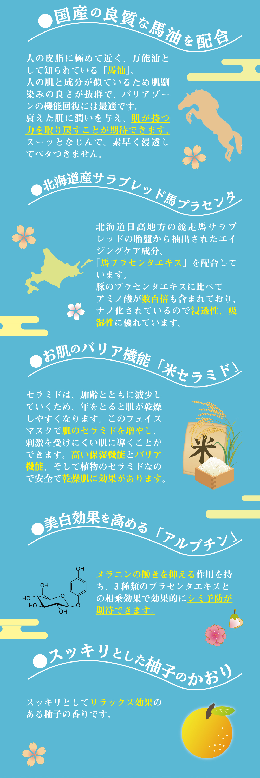 - 人の皮脂に極めて近く、万能油として知られている「馬油」。スーッとなじんで、素早く浸透してベタつきません。スッキリとしてリラックス効果があるゆずの香りのフェイスマスクです。