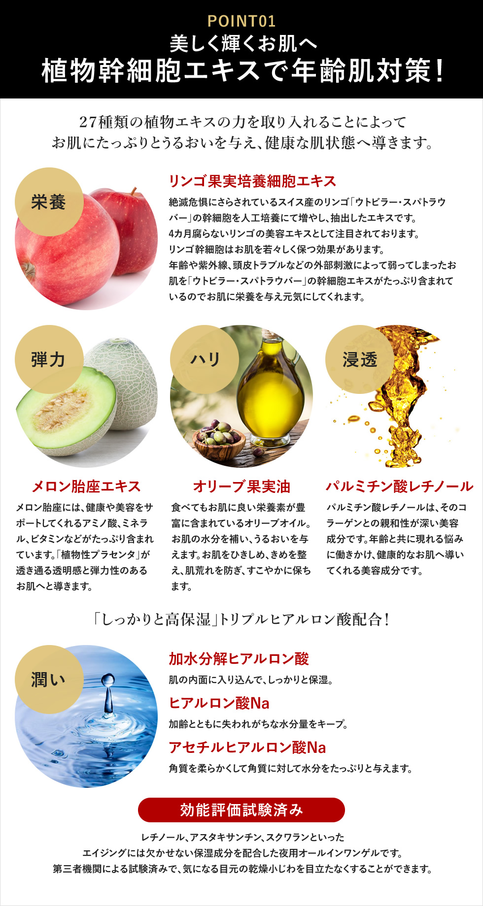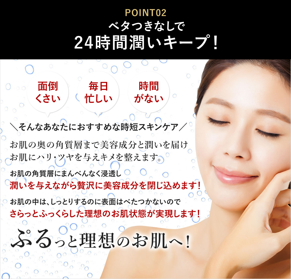 ヒアルロン酸やコラーゲンを始め、近年注目を集めているナイアシンアミドやすぐに肌になじむ水溶性のビタミンC誘導体(アスコルビルクルコシド)、人の皮脂に近い成分の馬油、アミノ酸豊富な馬プラセンタエキス配合でうるおいを夕方までキープさせます。