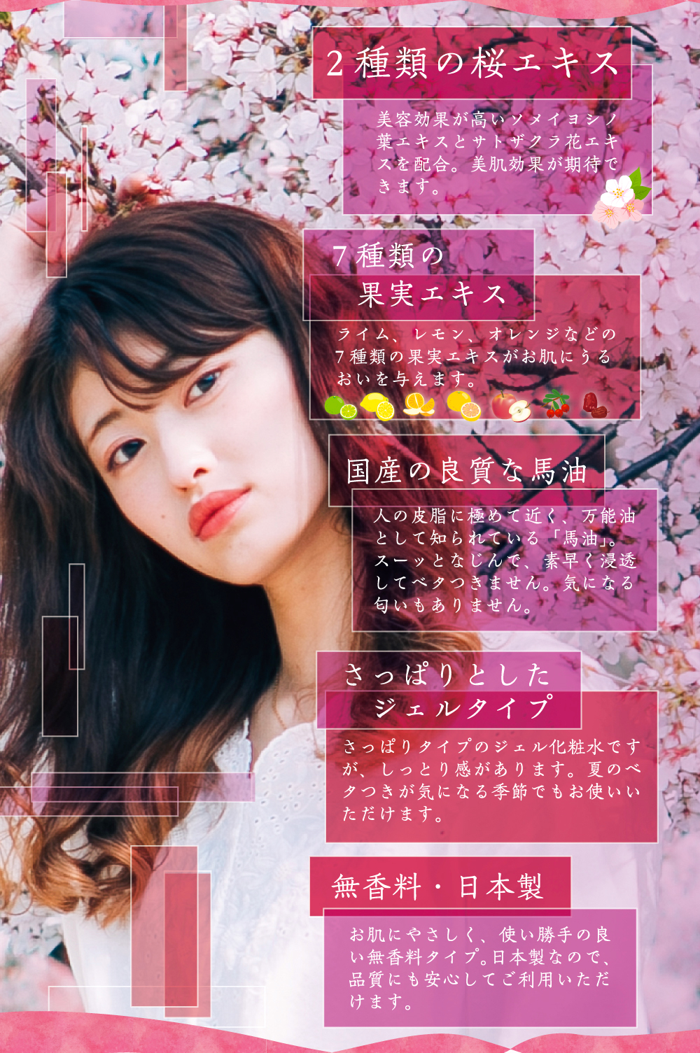 - 美容効果が高いソメイヨシノ葉エキスとサトザクラ花エキスを配合し、ライム、レモン、オレンジなどの7種類の果実エキスがお肌にうるおいを与えます。