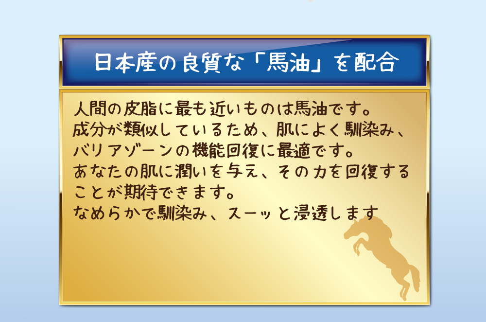 - 人の皮脂に極めて近く、万能油として知られている「馬油」。スーッとなじんで、洗い上がりに素早く浸透してベタつきません。