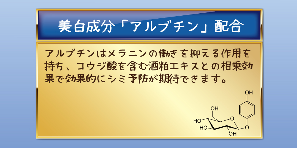 - アルブチンはメラニンの働きを抑える作用を持ち、コウジ酸を含む酒粕エキスとの相乗効果で効果的にシミ予防が期待できます。
