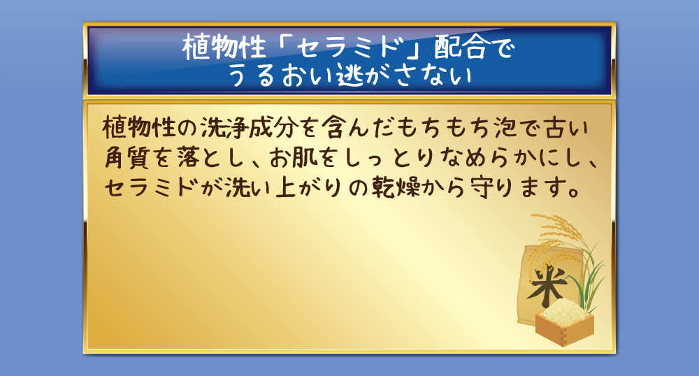 - 植物性の洗浄成分を含んだもちもち泡で古い角質を落とし、お肌をしっとりなめらかにし、セラミドが洗い上がりの乾燥から守ります。