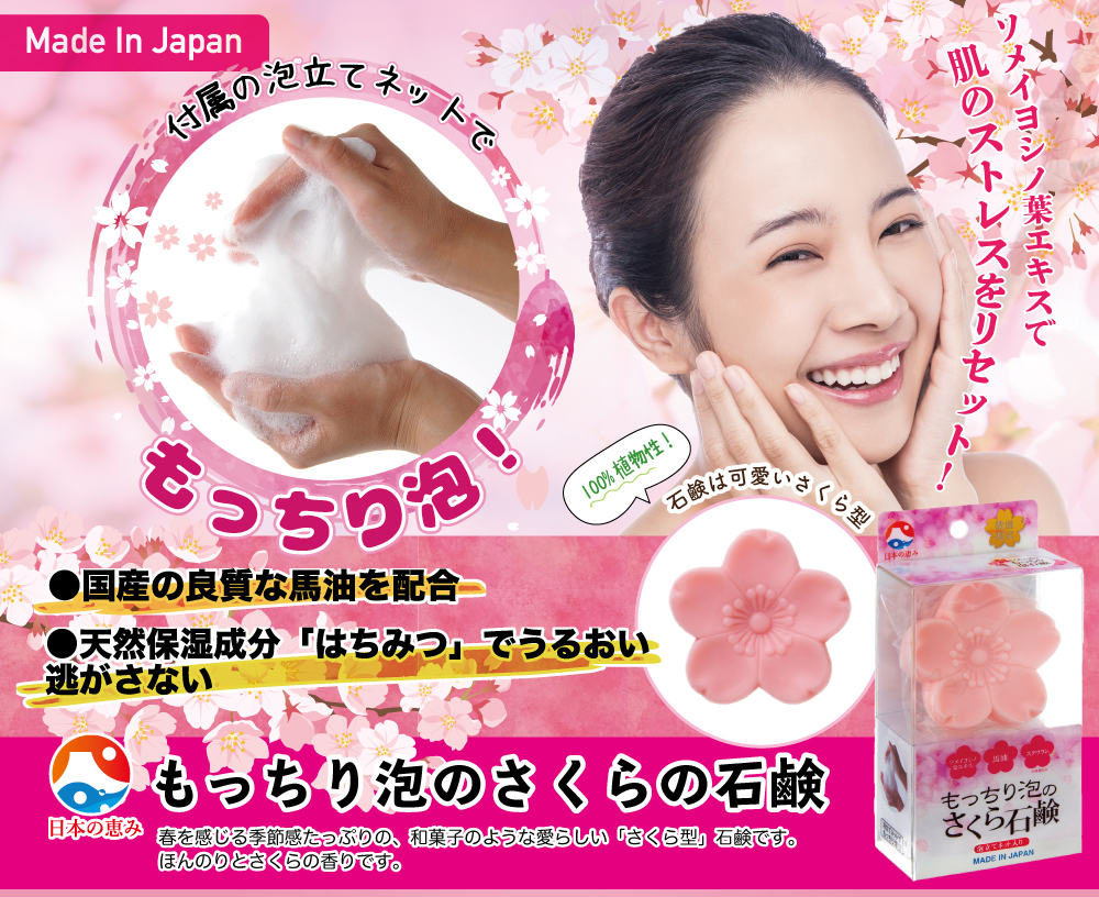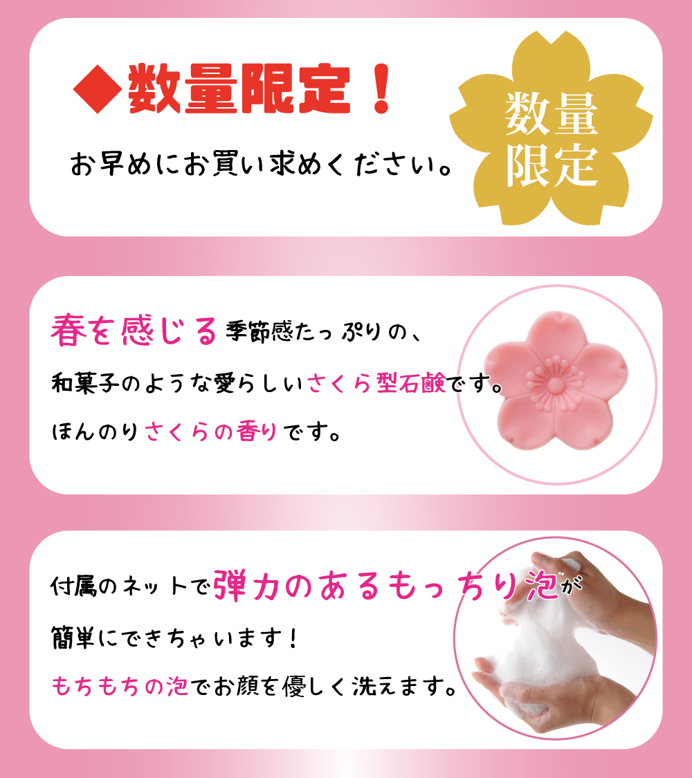 数量限定! 付属の泡立てネットでもっちり泡!さくら型の洗顔石鹸