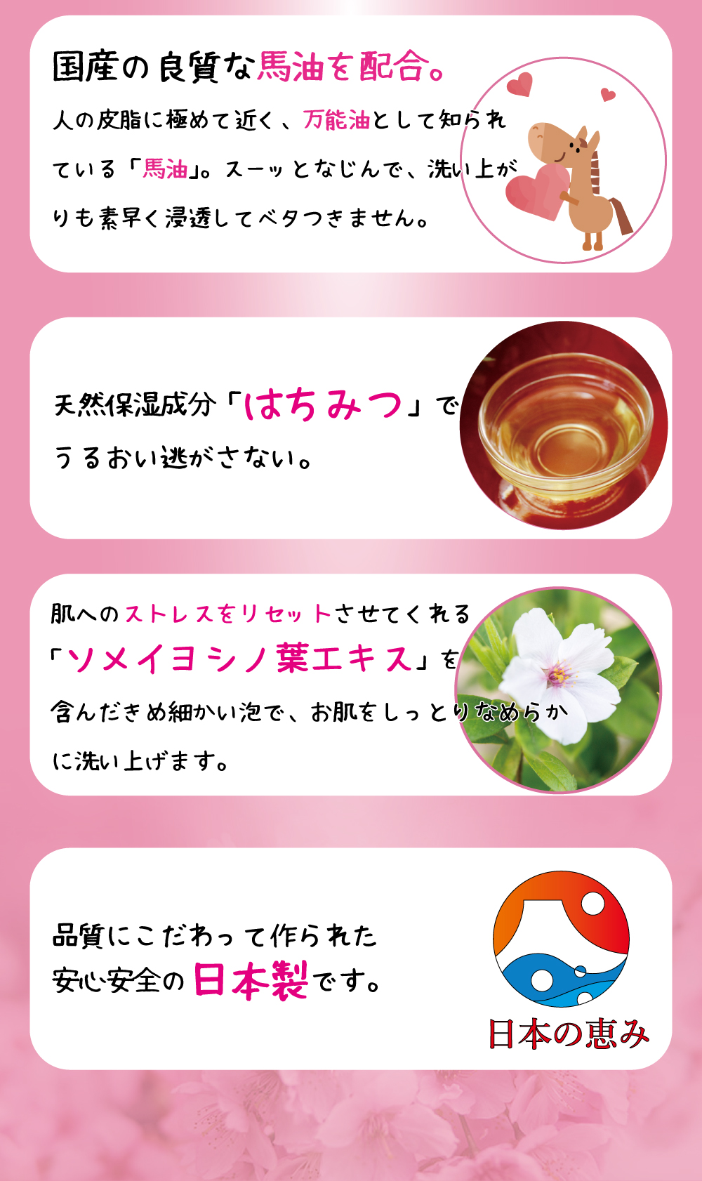 - 人の皮脂に極めて近く、万能油として知られている「馬油」。スーッとなじんで、洗い上がりも素早く浸透してベタつきません。
