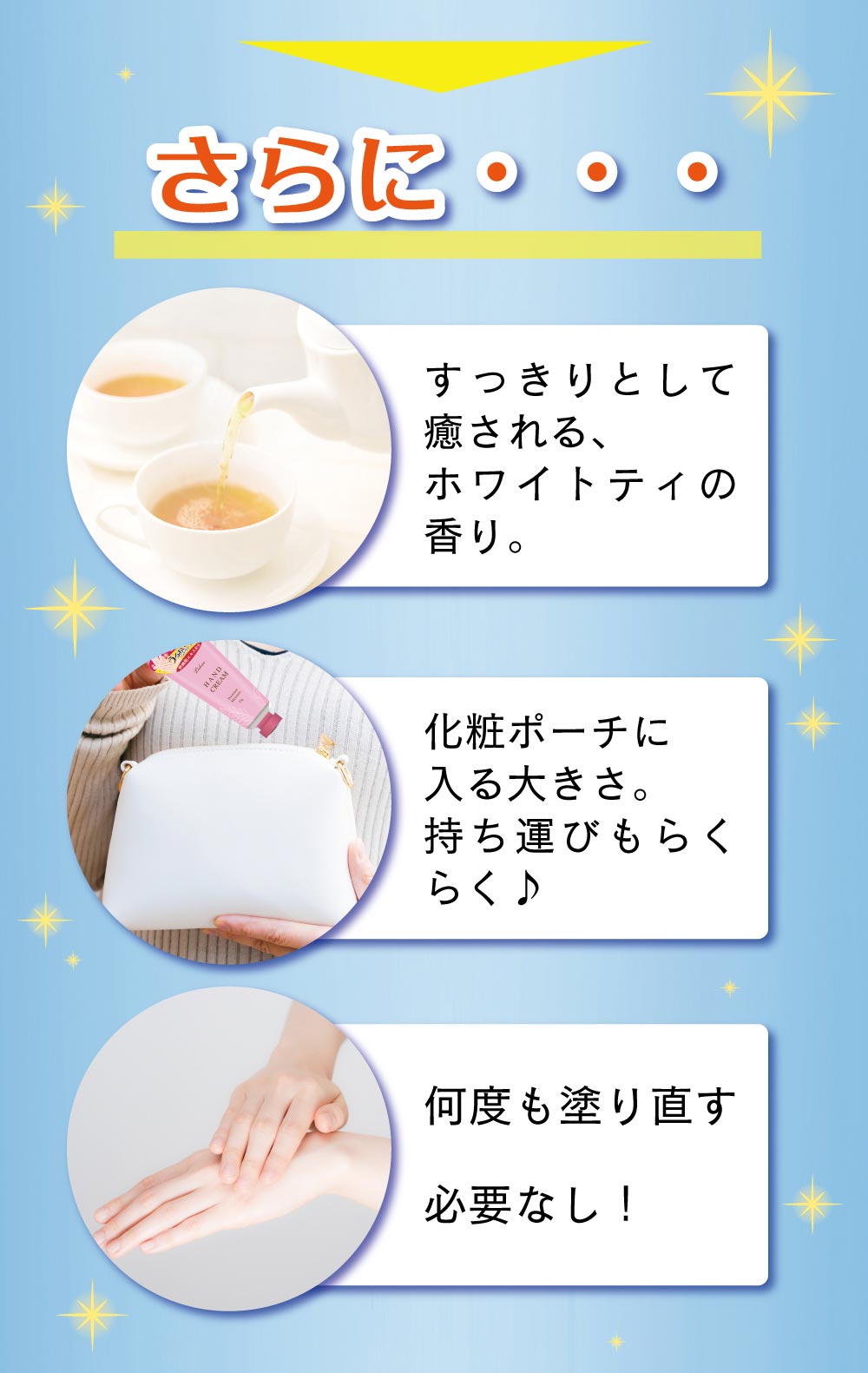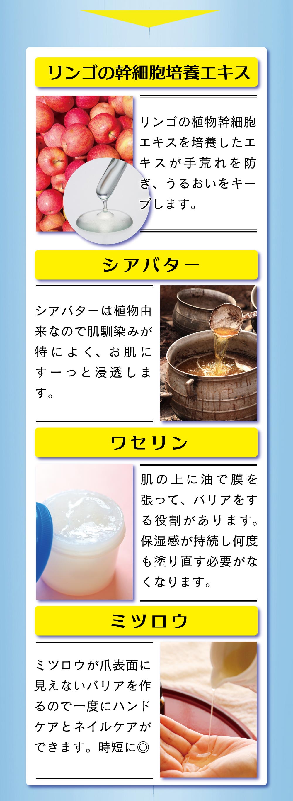 - ★ミツロウをプラスしたことにより、爪表面も見えないバリアを作るのでハンド&ネイルケアができる、時短ハンドクリームです。