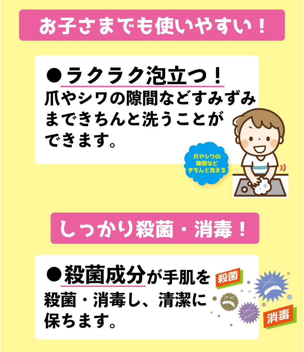 - ・殺菌成分が手肌を殺菌・消毒し、清潔に保ちます。ラクラク泡立たせることができ、爪やシワの隙間などすみずみまできちんと洗うことができます。