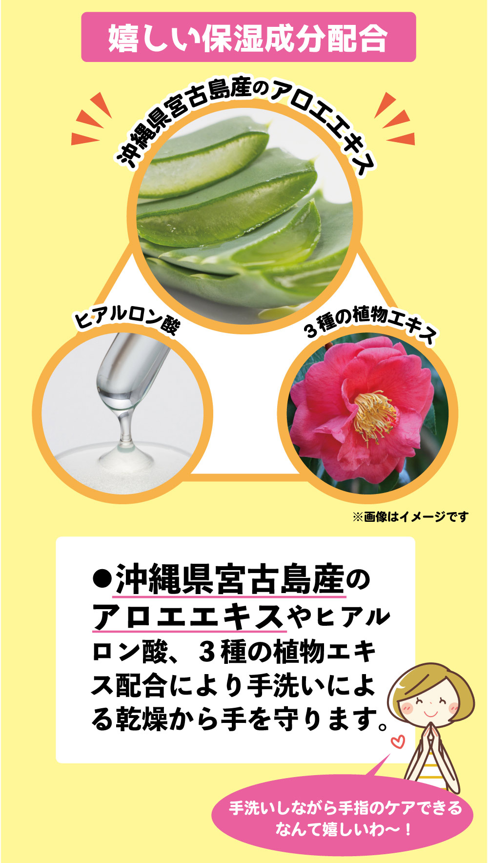 - ・沖縄県宮古島産のアロエエキスやヒアルロン酸、3種の植物エキス配合により手洗いによる乾燥から手を守ります。