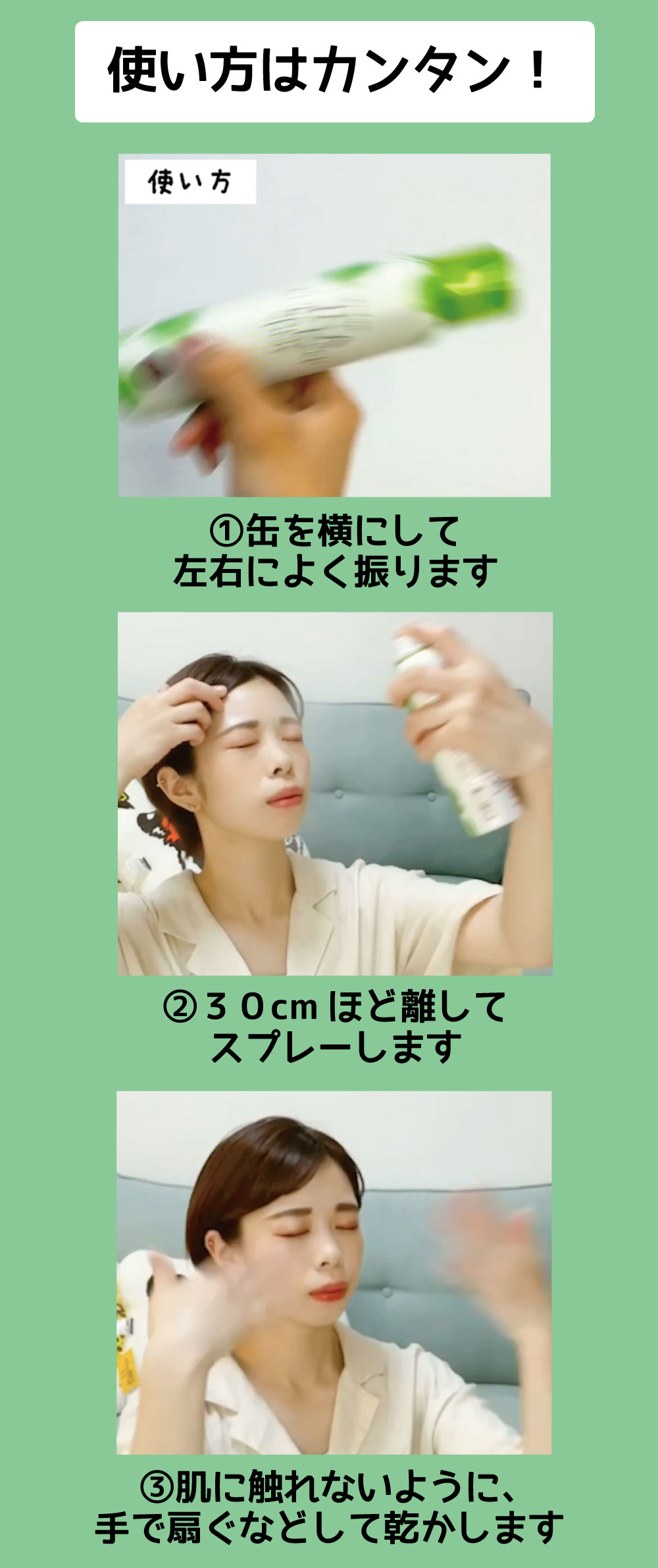 - ・逆さにしてもご使用できます。スプレーした後の肌質は、サラっとしてべたつきもありません。紫外線などが気になり、メイクもキープしたいアウトレジャーなどに、お直しにも大活躍するオールマイティースプレーです。